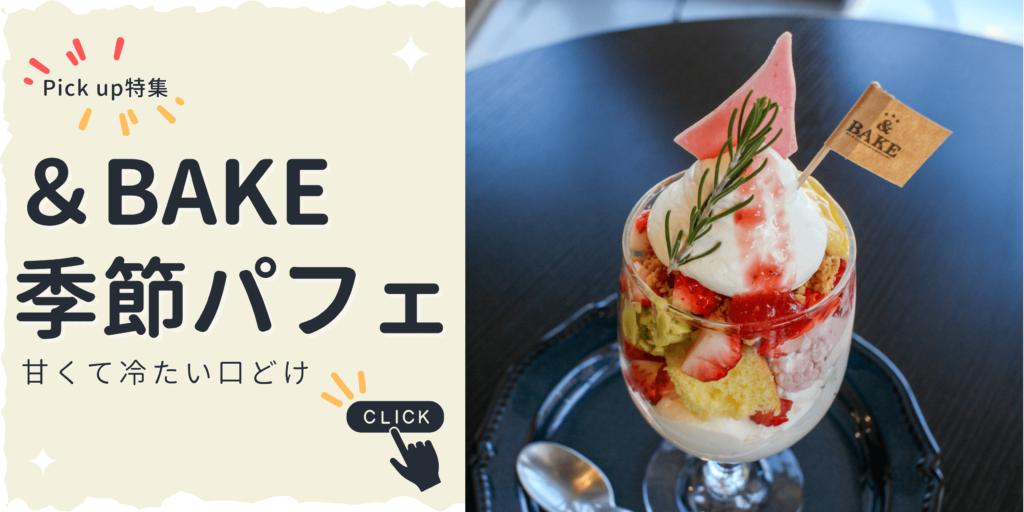 ふわふわシフォンケーキとパフェデザート。 アンドベイクの自慢のメニューを知っていただくため、わかりやすくまとめてみました。 &BAKEのパフェデザート特集 季節のフルーツを使った限定パフェデザートはいかがですか? &BAKEのシフォンケーキ特集 常時16種類ほど取り揃える自慢のシフォンケーキを、ご自宅にお持ち帰りしませんか?